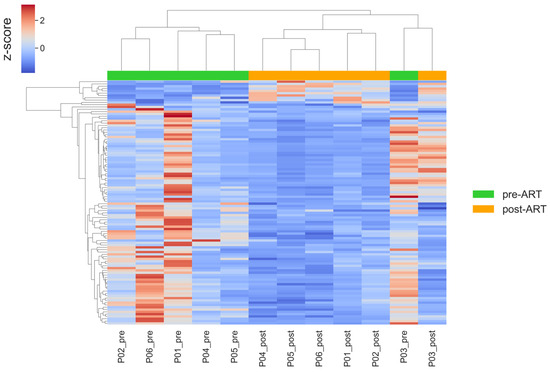 Hierarchical clustering heatmap of differentially expressed genes (|log2FC| > 0.5, adj. p < 0.05) before and after ART. Rows represent genes; columns represent patient samples. Values are row-wise z-scores (centered and scaled per gene); the color scale indicates relative expression (higher vs. lower) compared with each gene’s mean.