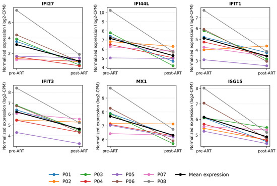 To better illustrate within-subject transcriptomic changes following ART initiation, we visualized the expression dynamics of representative interferon-stimulated genes using paired line plots (Figure 8). Specifically, we selected six canonical ISGs - IFI27 (log2FC −2.977, adj. p 0.00981), IFI44L (−1.854, 0.04827), IFIT1 (−1.726, 0.03545), IFIT3 (−1.601, 1.67 × 10−5), MX1 (−1.368, 6.56 × 10−4), and ISG15 (−1.279, 6.49 × 10−4)—which satisfied adj. p < 0.05 and exhibited large, consistent post-ART decreases. Each colored line represents an individual participant, allowing direct comparison of pre- and post-ART profiles, while the black line indicates the cohort mean normalized expression (log2CPM). All selected ISGs demonstrated a consistent decrease in expression after ART, reflecting attenuation of type I interferon signaling and immune activation. These findings highlight the robustness of the paired study design and confirm that ART rapidly normalizes interferon-related transcriptional activity in peripheral blood mononuclear cells.