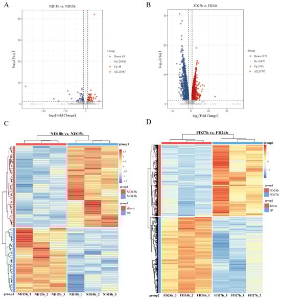 To investigate the molecular mechanisms underlying the observed decline in cell viability and loss of culturability, we performed transcriptomic analysis on ovarian tissues by comparing ND18h vs. ND15h (where OSC cultures failed versus succeeded at 19 °C) and FD27h vs. FD24h (where OSC cultures failed versus succeeded at 4 °C). High-quality transcriptomes were obtained from three independent biological replicates per time point (Q20 > 97%; mapping rate > 90%; Table A3 and Table A4), yielding 21,087 expressed genes. Differential expression analysis was performed by comparing the last viable time point with the first non-viable time point within each storage condition (ND18h vs. ND15h and FD27h vs. FD24h). This comparison identified 91 differentially expressed genes (DEGs) (48 upregulated and 43 downregulated) in the ND group and 3887 DEGs (1942 upregulated and 1945 downregulated) in the FD group. The reliability of the transcriptome data was confirmed by qRT-PCR (Figure 2D).