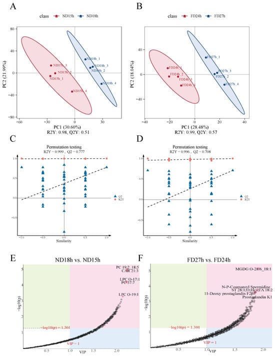 Score plots for PLS-DA in the (A) ND group and (B) FD group (n = 4). Permutation Test Plot and feature importance metabolites for OPLS-DA in the (C,E) ND18h vs. ND15h and (D,F) FD27h vs. FD24h. Notes: In the score plots, the closer R2Y and Q2 are to 1, the more stable and reliable the model is, Q2 > 0.5 indicates stable and reliable model, 0.3 < Q2 ≤ 0.5 indicates moderate model stability and reliability, and Q2 < 0.3 indicates poor model stability and reliability. In the loading plot, the variables are farther away from the origin in the direction of the horizontal coordinate contributes more to the differentiation between the two sets of samples.