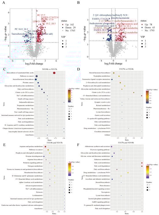 (A,B) Volcano plot analysis and (C,D) KEGG pathway enrichment analysis of differentially expressed metabolomics in ND18h vs. ND15h and FD27h vs. FD24h (n = 4). KEGG pathway enrichment analysis of (E) FD24h and ND15h, (F) FD27h and ND18h non DEMs (n = 4).