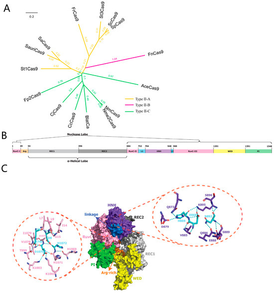 The Fp2Cas9 open reading frame spans 4647 nucleotides and encodes a protein of 1548 amino acids. To characterize Fp2Cas9 bioinformatically, we first conducted a phylogenetic analysis (Figure 1A). The analysis showed that Fp2Cas9 clusters within the Type II-C Cas9 subtype, exhibiting closer evolutionary relationships with homologs such as AceCas9, CjCas9, and NmeCas9, and more distant relationships with Type II-A (e.g., SpCas9, ScCas9) and Type II-B (FnCas9) enzymes. Domain architecture analysis indicated that Fp2Cas9 contains the characteristic domains of Cas9 nucleases, including the REC (recognition), HNH nuclease, and PI (PAM-interacting) domains, which are essential for DNA recognition and cleavage (Figure 1B). Structural analysis further revealed the polar interactions between catalytic residues and surrounding amino acids in these domains, offering insights into the structural basis of Fp2Cas9 nuclease activity (Figure 1C). Collectively, these analyses define the evolutionary, domain, and structural features of Fp2Cas9, providing a foundation for further investigation of its functional properties as a nuclease.