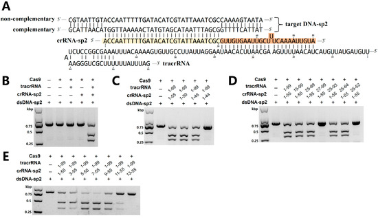 Purified tracrRNA and crRNA were annealed by heating to 95 °C for 3 min followed by gradual cooling to room temperature (~2 h). DNA cleavage assays were performed in Cas9 reaction buffer (20 mM HEPES, 150 mM KCl, 10 mM MgCl2, 0.5 mM DTT, 0.1 mM EDTA). Reaction mixtures (20 µL final volume) contained 1 × Cas9 reaction buffer, 500 nM Cas9, 500 nM crRNA-tracrRNA dimer (or 500 nM sgRNA), and 25 nM target dsDNA. Specifically, reactions were assembled by sequentially adding 10 × Cas9 reaction buffer, Cas9, and the crRNA:tracrRNA dimer to DEPC-treated water. After mixing, the complex was incubated at 18 °C for 10 min to allow ribonucleoprotein (RNP) formation. The target dsDNA was added and the reaction volume adjusted to 20 µL with DEPC-treated water, followed by incubation at 18 °C for 1 h to allow DNA cleavage. Reactions were terminated by adding 2 µL proteinase K and heating at 37 °C for 15 min. Cleavage products were resolved by electrophoresis on a 1.5% (w/v) agarose gel prepared in 1× TAE buffer and stained with GelStain (TransGen Biotech, Beijing, China). Electrophoresis was performed at 5–6 V/cm for 45 min. Gels were visualized using a UV transilluminator and images were captured with a gel documentation system.