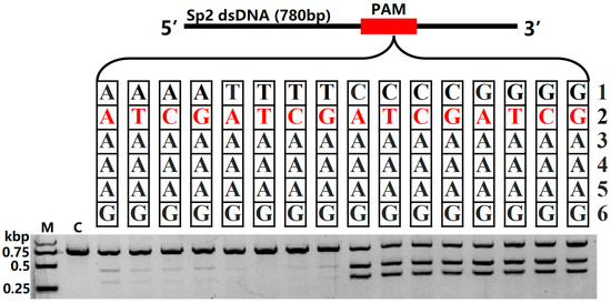 Impact of single-nucleotide substitutions in the PAM on Fp2Cas9 DNA cleavage activity (M, maker; kbp, kilobase pairs; C, control).