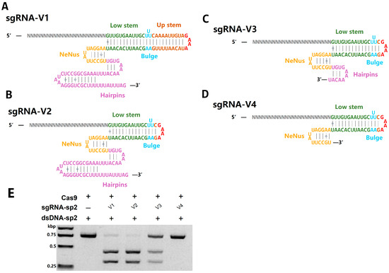 To enable programmable DNA targeting by Fp2Cas9, we utilized the truncation results from Section 2.2 to fuse the functional crRNA (7–55 nt) and tracrRNA (nucleotides 15–99 nt) via a stable GAAA tetraloop, thereby generating the sgRNA-V1 capable of directing Cas9 to specific DNA targets (Figure 4A). Guided by the study on functional gRNA fragments [31], we further modified this design by deleting the upstream region to create a more compact sgRNA-V2 and introduced systematic truncations in the hairpin regions to produce additional variants, sgRNA-V3 and sgRNA-V4 (Figure 4B–D). These sgRNA variants were evaluated using in vitro DNA cleavage assays (Figure 4E), allowing direct comparison of their efficiency in guiding Cas9-mediated nuclease activity. The results demonstrated that sgRNA-V1, sgRNA-V2, and sgRNA-V3 could all successfully replace the native crRNA–tracrRNA duplex, with sgRNA-V1 and sgRNA-V2 exhibiting the highest guiding efficiency. Considering both functionality and compactness, sgRNA-V2 was selected as the preferred variant for subsequent experimental applications.