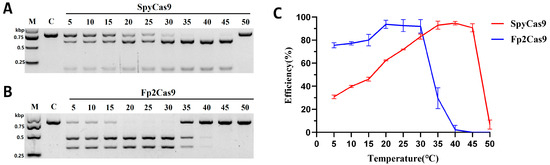 To assess the temperature-dependent cleavage activity of Fp2Cas9, SpyCas9 was used as a reference nuclease. A SpyCas9-targeting gRNA (spy-sp2-gRNA) was designed for the sp2 target using ChopChop, whereas Fp2Cas9 employed fp-sp2-gRNA-V2, as described in Section 2.4. RNP complexes (500 nM Cas9: 500 nM gRNA) were incubated with 25 nM target DNA over a temperature range of 5–50 °C. SpyCas9 showed maximal activity (above 90% substrate cleavage) at 30–40 °C, with cleavage efficiency decreasing linearly to 28% at 5 °C (Figure 5A,C). In contrast, Fp2Cas9 reached maximal nuclease activity at 20–30 °C, achieving cleavage efficiency of up to 90%. Its activity gradually decreased at lower temperatures, yet 75% cleavage efficiency was retained at 5 °C. However, Fp2Cas9 exhibited limited thermostability: cleavage efficiency declined to 29% at 35 °C and was almost completely lost at 40 °C (Figure 5B,C). These results indicate that Fp2Cas9 is a cold-adapted Cas9 nuclease with high activity at low temperatures but reduced stability at higher temperatures, highlighting its potential utility in low-temperature biological systems.