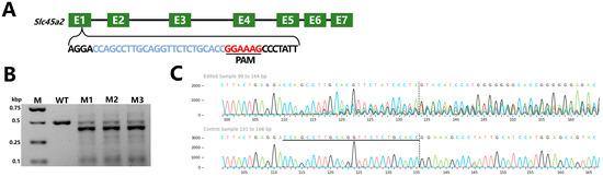 CRISPR/Fp2Cas9-mediated knockout of the zebrafish slc45a2 gene. (A) Schematic representation of the zebrafish slc45a2 gene structure and the exon 1 target site used for CRISPR/Fp2Cas9 editing. The target sequence is shown in blue, and the PAM sequence is indicated in red. (B) Detection of mutations in F0 zebrafish by T7EI assay. (C) Sanger sequencing chromatograms of F0 mutants show overlapping peaks near the target site, indicating insertions or deletions (indels). (M, DNA marker; M1–M3, F0 zebrafish injected with CRISPR/Fp2Cas9 targeting slc45a2; WT, wild-type control).
