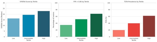 A progressive increase in the prevalence of functionally significant lesions was observed across tertiles of inflammatory biomarker levels. In patients within the lowest tertile (T1), 35% of lesions demonstrated FFR < 0.80, compared to 52% in the intermediate tertile (T2) and 68% in the highest tertile (T3). This trend supports a strong association between systemic inflammation and the likelihood of ischemia-inducing coronary lesions. Similarly, the presence of TCFA, as assessed by OCT, increased markedly across tertiles. TCFA was identified in 20% of patients in the lowest tertile, rising to 40% in the intermediate tertile, and reaching 62% in the highest tertile. As shown in Figure 1, all three parameters—SYNTAX score, prevalence of FFR < 0.80 lesions, and frequency of TCFA—increased progressively across inflammatory tertiles. These differences were statistically significant (SYNTAX score, p = 0.03; FFR < 0.80: p = 0.02; TCFA presence: p < 0.01).