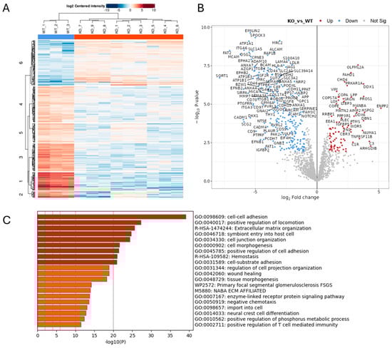 Proteomics analysis of conditioned medium from triplicate cultures of Wt U251 and three ADAM10 KO clones (clone 1: KO 1–3; clone 2: KO 4–6; clone 3: KO 7–9) (A,B). Heatmap (A), and volcano plot (B) of significantly, differentially expressed proteins (≥2-fold). (Blue: downregulated). (C) Gene ontology (GO)/protein annotation analysis of significantly downregulated proteins: bar graph shows enriched terms across input gene lists, coloured by p-value (https://metascape.org).
