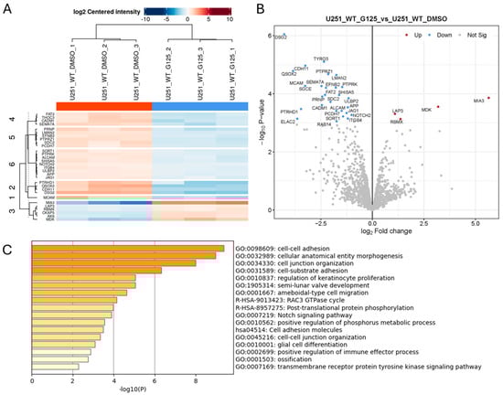 Proteomics analysis of conditioned medium from triplicate cultures of Wt U251 cells treated for 6 h with 10µM ADAM10 inhibitor GI254023X (G125) or DMSO vehicle control. Heatmap (A), and volcano plot (B) of significantly, differentially expressed proteins (≥2-fold). (Blue: downregulated in inhibitor-treated cultures). (C) Protein annotation analysis of significantly downregulated proteins: bar graph shows enriched terms across input gene lists, coloured by p-value (https://metascape.org).