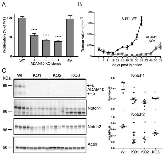 (A) Comparison of proliferation of Wt and ADAM10 KO U251 cells. Equal numbers of cells were plated in replicate wells and assayed after 3 days by MTS assay (mean ± SEM, n = 6, **** p < 0.0001). EV, control U251 cell line transfected with empty vector (Cas9 only). (B) Comparison of Wt and ADAM10 KO U251 clones, grown as subcutaneous tumours in NSG mice (mean volume ± SEM, n = 6/group). (C) Western blot of ADAM10 immunoprecipitates (top) or total tumour lysates, probed with antibodies for ADAM10 and Notch proteins, or actin as loading control. Graph shows quantification of band intensities, relative to actin (individual values with mean ± SEM; * p < 0.05, ** p < 0.01). u, unprocessed ADAM10; p, processed ADAM10.
