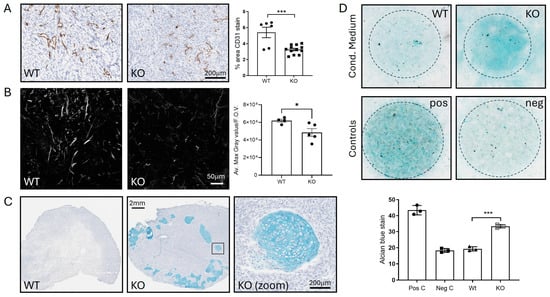 We then analysed tumours for histological changes associated with the above changes in protein abundance. We analysed blood vessel density by staining for the endothelial marker CD31, since along with Notch, we had identified reduced shedding of several proteins linked to angiogenesis. Vessel staining was significantly reduced in ADAM10 KO U251 tumours, compared to Wt (Figure 6A). We also analysed the tumour ECM, particularly collagen fibrils, by second harmonic generation (SHG) imaging. This indicated a decrease in fibrils in ADAM10 KO tumours, reflecting the reduced levels of collagens, the cross-linker LOXL3, and other ECM proteins identified above (Figure 6B). Unexpectedly, we also noted clumps of cells with a chondrocyte-like morphology in ADAM10 KO, but not Wt U251 tumours. These stained positively with Alcian blue, a dye that binds to polysaccharides in cartilaginous ECM, supporting their chondrocytic identity (Figure 6C). Interestingly, several fibrinogens were notably more abundant in ADAM10 KO tumours and are known to be associated with chondrogenic differentiation []. Since the alterations of proteins associated with chondrocyte development were evident in tumours and not cultured cells, and included mouse proteins, this indicated possible involvement of the TME: specifically, stem-like stromal progenitor cells (mesenchymal stromal/stem cells, or MSCs) that can differentiate into chondrocytes. We therefore tested if conditioned medium from parental or ADAM10 KO U251 tumour cells could initiate differentiation of mouse MSCs in culture. Indeed, MSCs grown in conditioned medium from ADAM10 KO but not Wt U251 cells showed increased staining by Alcian blue, indicative of chondrogenic differentiation (Figure 6D). Since only the ADAM10 KO tumours showed chondrocyte differentiation, and only the ADAM10 KO cell-conditioned medium caused MSC chondrocyte differentiation, this suggests that the loss of ADAM10 from U251 cells leads to changes in secreted factors that inhibit cell stemness and promote differentiation.