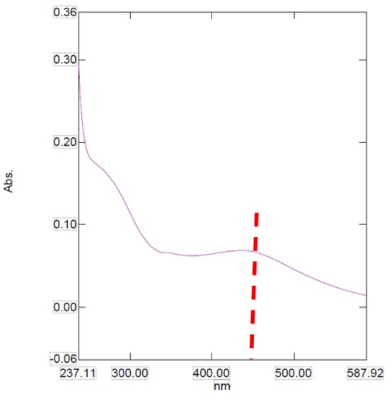 Synthesis was performed following a modified literature method [], using aqueous AgNO3 at one concentration (3 mM) to ascertain the proper conditions optimal for AgNPs formation (Figure 11). Plant extract and AgNO3 solution were combined at a constant extract-to-salt volume ratio (1:9), maintained throughout all tests. The pH of the reaction was brought up to 8.0 with the gradual addition of 0.1 M NaOH while maintaining continuous stirring. The mixture was kept at 60 °C for 2 h with continuous mixing. After completion, the dispersion was left to cool to ambient temperature and subsequently centrifuged at 1000 rpm for 15 min. The resulting supernatant was collected for future tests confirming the formation of AgNPs.