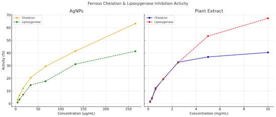 Phytochemical screening of the Lespedeza capitata extract revealed the presence of both hydrophilic and lipophilic compounds, with a predominance of lipophilic metabolites. Since such compounds typically display reduced oral bioavailability, nanoformulation offers a significant advantage by improving solubility, absorption and cellular uptake [,]. In the present study, AgNPs synthesized using the plant extract displayed markedly enhanced biological effects compared with the crude extract. Specifically, antioxidant assays (Table 1, Table 2 and Table 3) demonstrated that the nanoparticles exhibited at least a ten-fold stronger activity in both ferrous ion chelation and lipoxygenase inhibition assays (Figure 4).