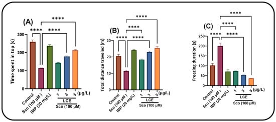 The NTT evaluates the anxiety response triggered by novelty. In the NTT test, one-way ANOVA demonstrated a significant effect of the treatment on the time spent in the top zone of the tank (F (5, 54) = 107.4, p < 0.0001) (Figure 8A), total distance traveled (F (5, 54) = 50.25, p < 0.0001) (Figure 8B) and freezing duration (F (5, 54) = 50.79, p < 0.0001) (Figure 8C). Sco treatment markedly reduced the duration at the upper zone of the tank (p < 0.00001) and augmented freezing behavior (p < 0.00001) relative to the control group. The reduction in total distance traveled (p < 0.00001) and Sco therapy resulted in a hypolocomotor effect relative to the control group. The anxiolytic-like effect of LCE treatment (1, 3, and 5 μg/L) was observed by an increase in the duration spent in the upper zone of the tank (p < 0.00001) and a reduction in freezing duration (p < 0.00001) relative to the Sco-alone treated animals. Furthermore, LCE administration (1, 3 and 5 μg/L) mitigates the hypolocomotor effects of Sco, as seen by the increased total distance traveled (p < 0.00001) in comparison to fish treated just with Sco. Imipramine (IMP, 20 mg/L), a positive reference compound, markedly enhanced the duration spent in the upper zone of the tank and reduced freezing time, indicating a diminution of the anxiogenic reaction. Nonetheless, the anxiolytic reaction, concomitant with the enhancement of locomotor activity, was evidenced by a substantial increase in the total distance traversed by the zebrafish in the tank when Sco-alone treated zebrafish were subjected to LCE administration.