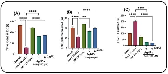 In the AgNPs treatment, the NTT test indicated that one-way ANOVA demonstrated a significant impact of the treatment on the duration spent in the upper zone of the tank [F (4, 45) = 300.1, p < 0.0001] (Figure 8A), on the total distance traversed [F (4, 45) = 25.37, p < 0.0001] (Figure 8B) and on the duration of freezing [F (4, 45) = 64.69, p < 0.0001] (Figure 8C). Sco administration markedly reduced the duration in the upper zone of the tank (p < 0.00001) (Figure 8A) and enhanced freezing behavior (p < 0.00001) (Figure 8C) relative to the control group. Sco therapy resulted in a hypolocomotor effect by reducing the total distance walked (p < 0.00001) (Figure 8B) in comparison to the control group. The anxiolytic-like effect of AgNPs (3 and 6 μg/L) treatment was observed through an increased duration in the upper zone of the tank (Figure 8A) (p < 0.00001) and a reduction in freezing duration (Figure 8C) (p < 0.00001) relative to the Sco-alone treated subjects.