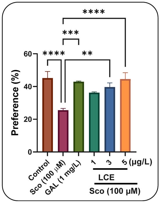 The effects of LCE (1, 3 and 5 μg/L) administration in scopolamine (Sco, 100 µM)-treated zebrafish on the preference percentage evaluated within the novel object recognition test (NOR). Values are means ± S.E.M. (n = 10). For Tukey’s post hoc analyses, **** p < 0.00001, *** p < 0.0001 and ** p < 0.001.