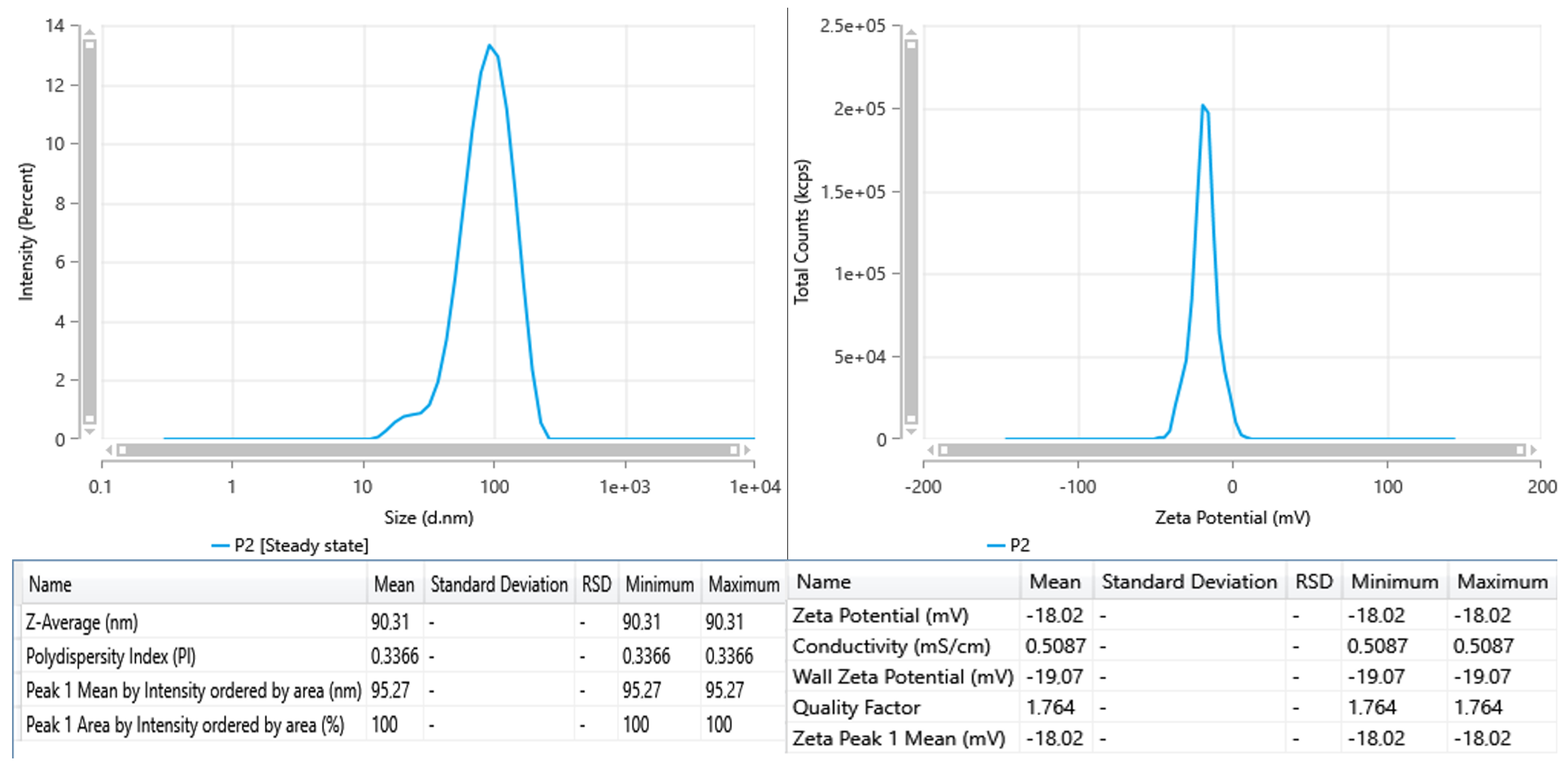 The DLS tests for the sample indicate a singular distinct distribution peak centered around 95.3 nm, with a Z-average hydrodynamic diameter of 90.3 nm (Figure 2). The PDI of 0.3366 signifies a somewhat polydisperse system; however, it remains within an acceptable range for colloidal suspensions. The lack of secondary peaks shows that the particle distribution is reasonably homogeneous and devoid of substantial aggregates or larger particles.