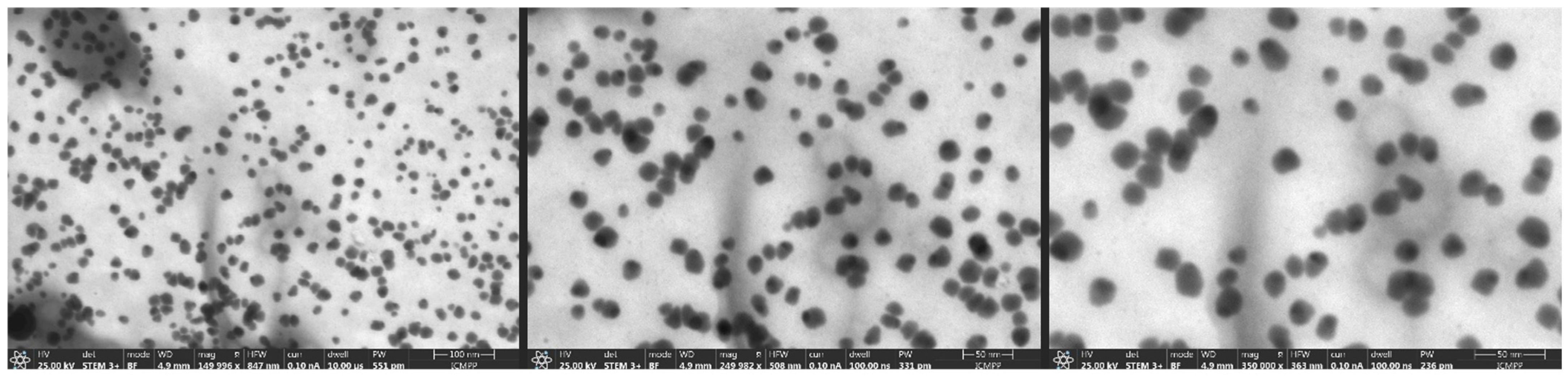 The STEM images for the sample (Figure 3) exhibit a significantly more homogeneous particle morphology and distribution. The nanoparticles primarily present as spherical and exhibit good dispersion, showing minor evidence of agglomeration. The size distribution in the images confirms the DLS results, which suggested a mean hydrodynamic diameter of around 90.3 nm and a PDI of 0.3366. The STEM images present spherical nanoparticles with average sizes from 15 to 20 nm; each individual nanoparticle is separate and perfectly dispersed in liquid.