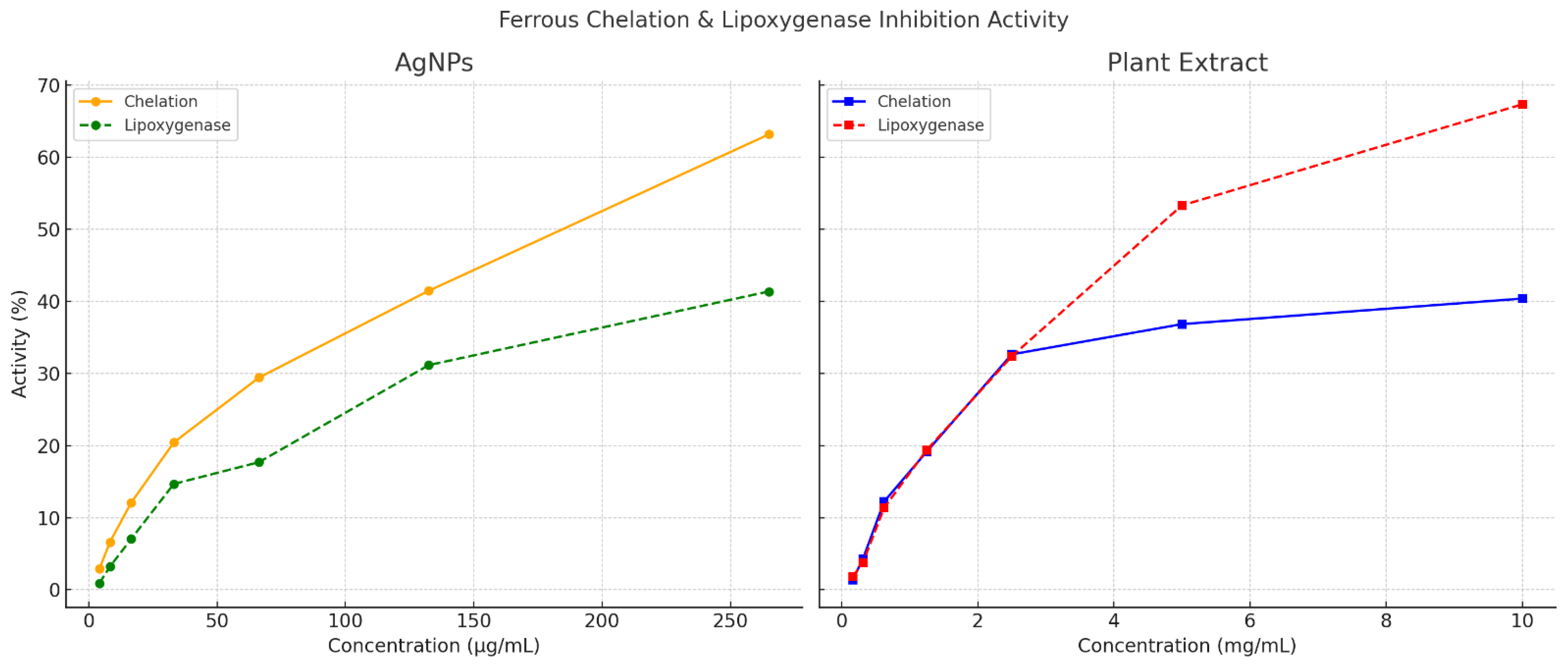 Figure 4. Ferrous ion chelation and lipoxygenase inhibition for the plant extract and AgNPs.