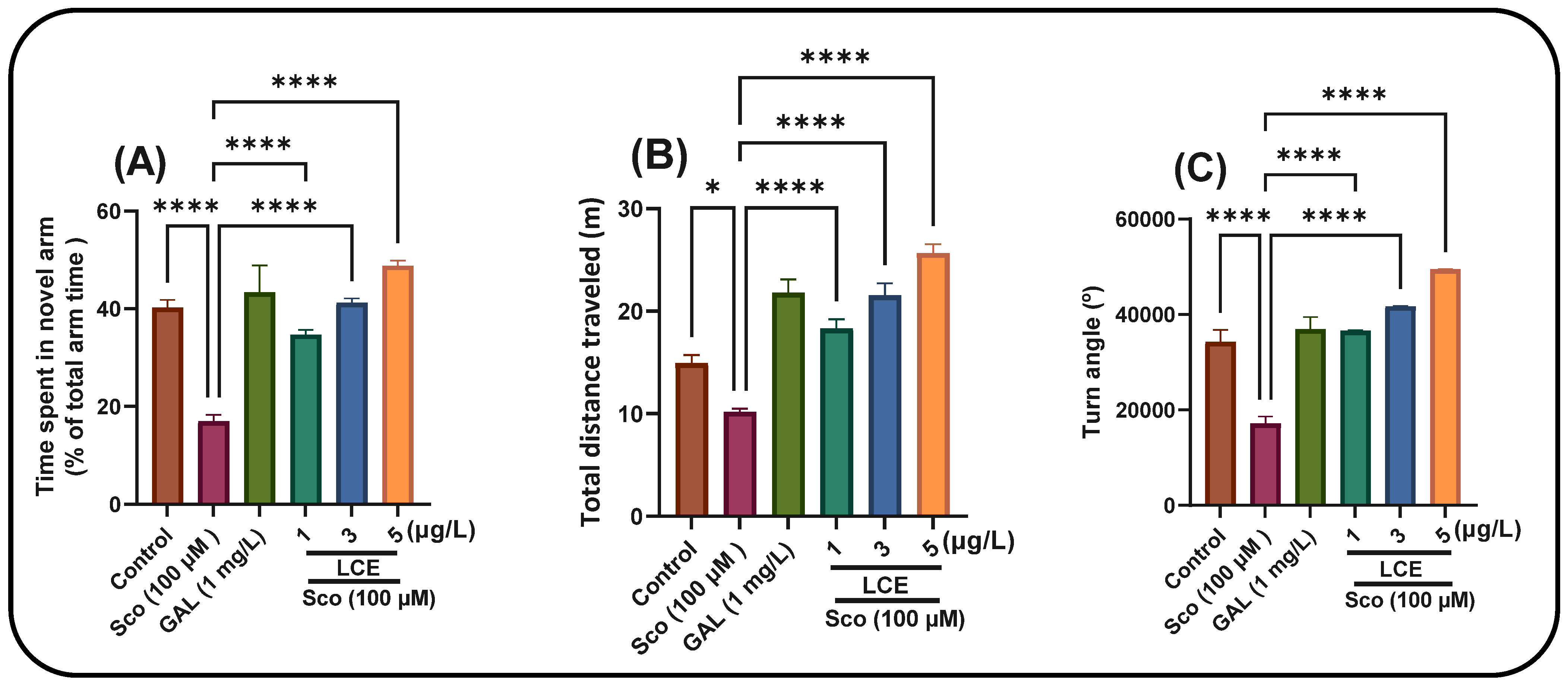 Figure 5. Assessment of response to novelty in Sco (100 µM)-treated zebrafish subjected to LCE treatment at doses of 1, 3 and 5 μg/L in the Y-maze test. (A) Time spent in the novel arm (% of total arm time); (B) Total distance traveled (m); (C) Turn angle (°). Data are presented as means ± S.E.M. (n = 10 animals per group). * p < 0.0 and **** p < 0.00001 (Tukey’s post hoc analyses). Galantamine (GAL, 1 mg/L) was used as a reference positive drug.