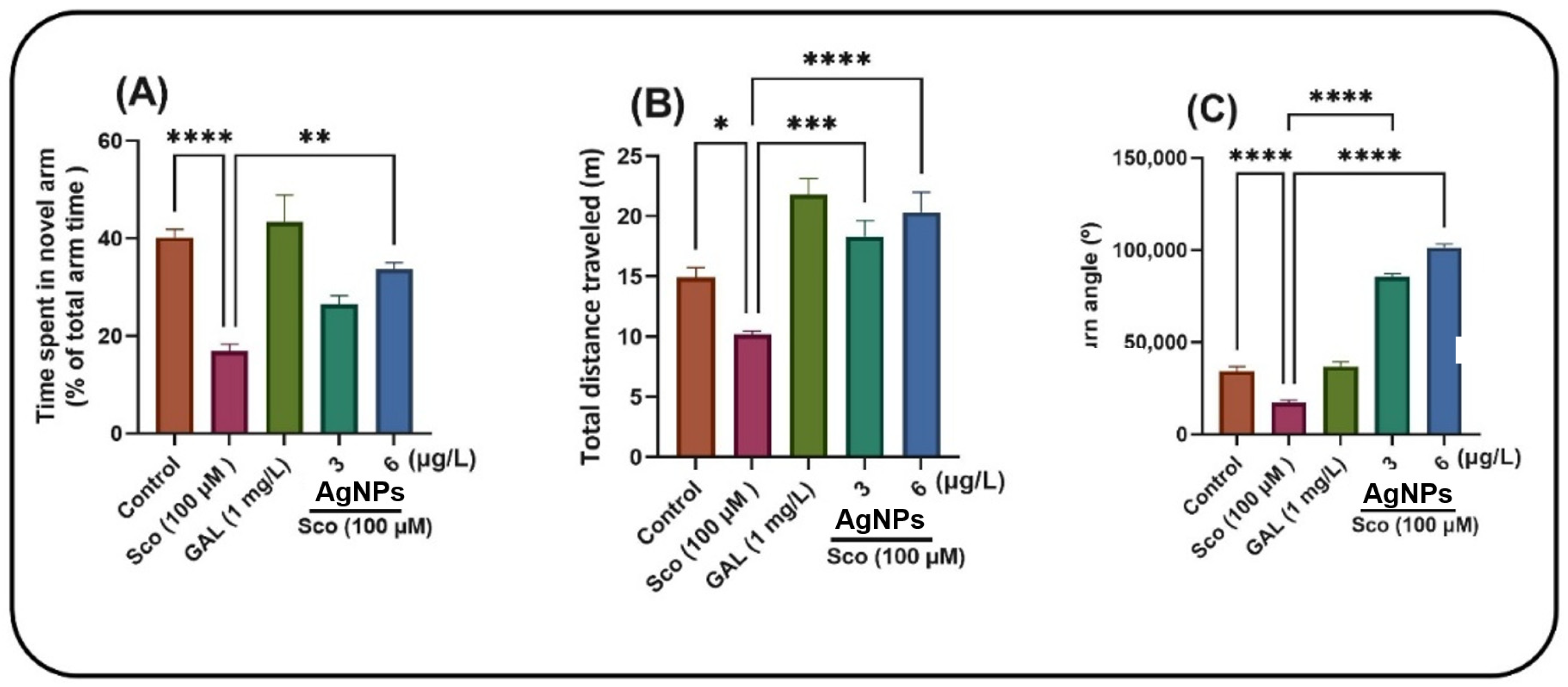 Figure 6. Assessment of the response to novelty in Sco (100 µM)-treated zebrafish subjected to AgNPs treatment at doses of 3 and 6 μg/L in the Y-maze test. (A) Time spent in the novel arm (% of total arm time), indexing of spatial memory; (B) Total distance traveled (m), indexing locomotion; (C) Turn angle (°), indexing exploratory strategy. Data are presented as means ± S.E.M. (n = 10 animals per group). * p < 0.01, ** p < 0.001, *** p < 0.0001 and **** p < 0.00001 (Tukey’s post hoc analyses). Galantamine (GAL, 1 mg/L) was used as a reference positive drug.