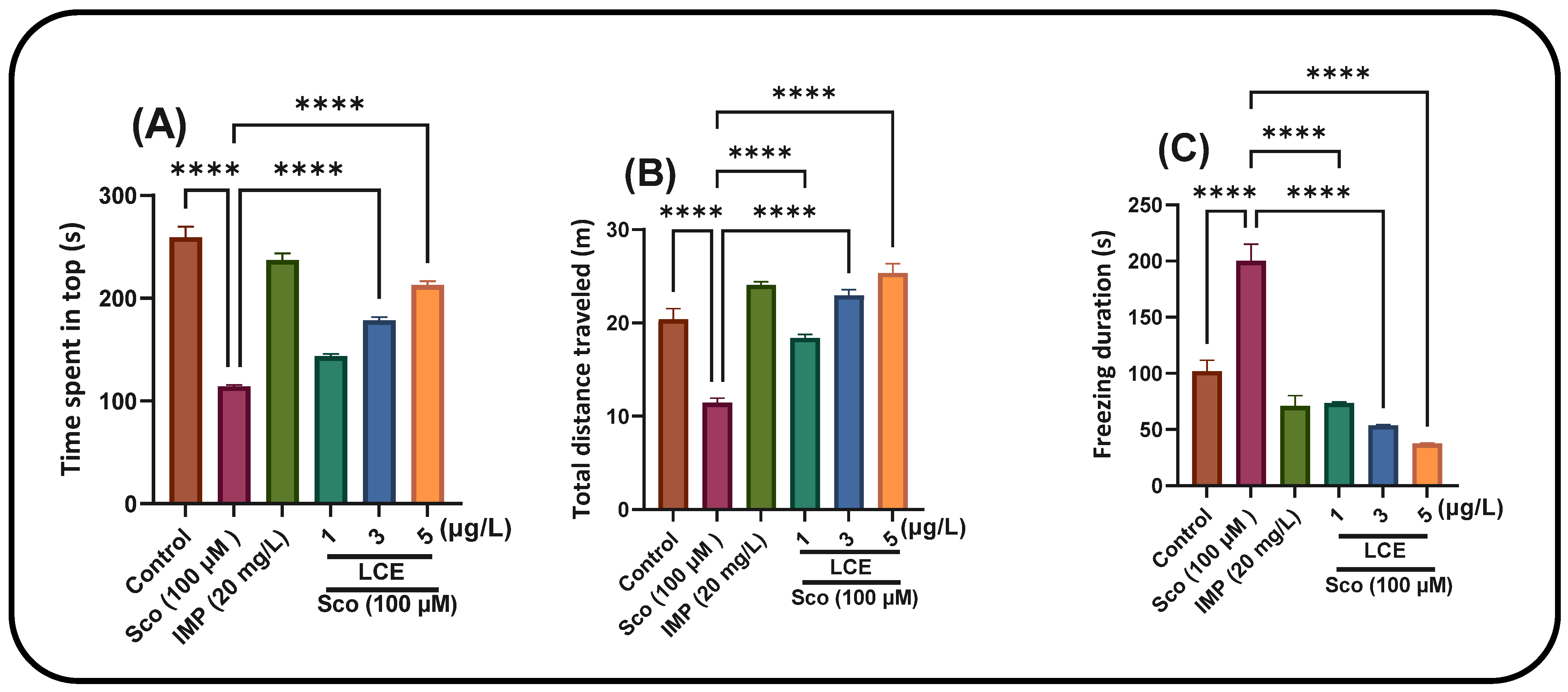 Figure 7. The effects of LCE (1, 3 and 5 μg/L) administration in scopolamine (Sco, 100 µM)-treated zebrafish on anxiety behavior evaluated within the novel tank diving test (NTT). Anxiety response: time spent in the top (s) and freezing duration (s) in different groups. Locomotion: total distance traveled (m) in different groups. Values are means ± S.E.M. (n = 10). For Tukey’s post hoc analyses, **** p < 0.00001.