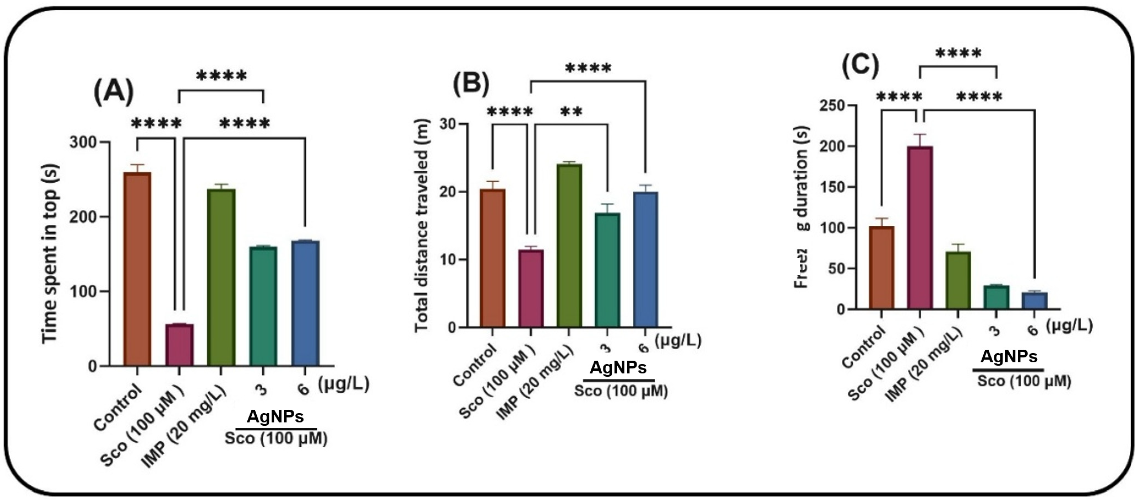 Furthermore, the administration of AgNPs (3 and 6 μg/L) mitigates the hypolocomotor effects of Sco, as seen by the increased total distance traveled (Figure 8B) (p < 0.001 for 3 μg/L and p < 0.00001 for 6 μg/L) in comparison to fish treated solely with Sco. Imipramine (IMP, 20 mg/L), a positive reference compound, markedly enhanced the duration spent in the upper zone of the tank and reduced freezing time, indicating a reduction in the anxiogenic reaction. Nonetheless, the anxiolytic response, concomitant with the enhancement of locomotor activity, was evidenced by a substantial increase in the total distance traversed by the zebrafish in the tank when Sco-alone-treated zebrafish were subjected to AgNPs administration.
