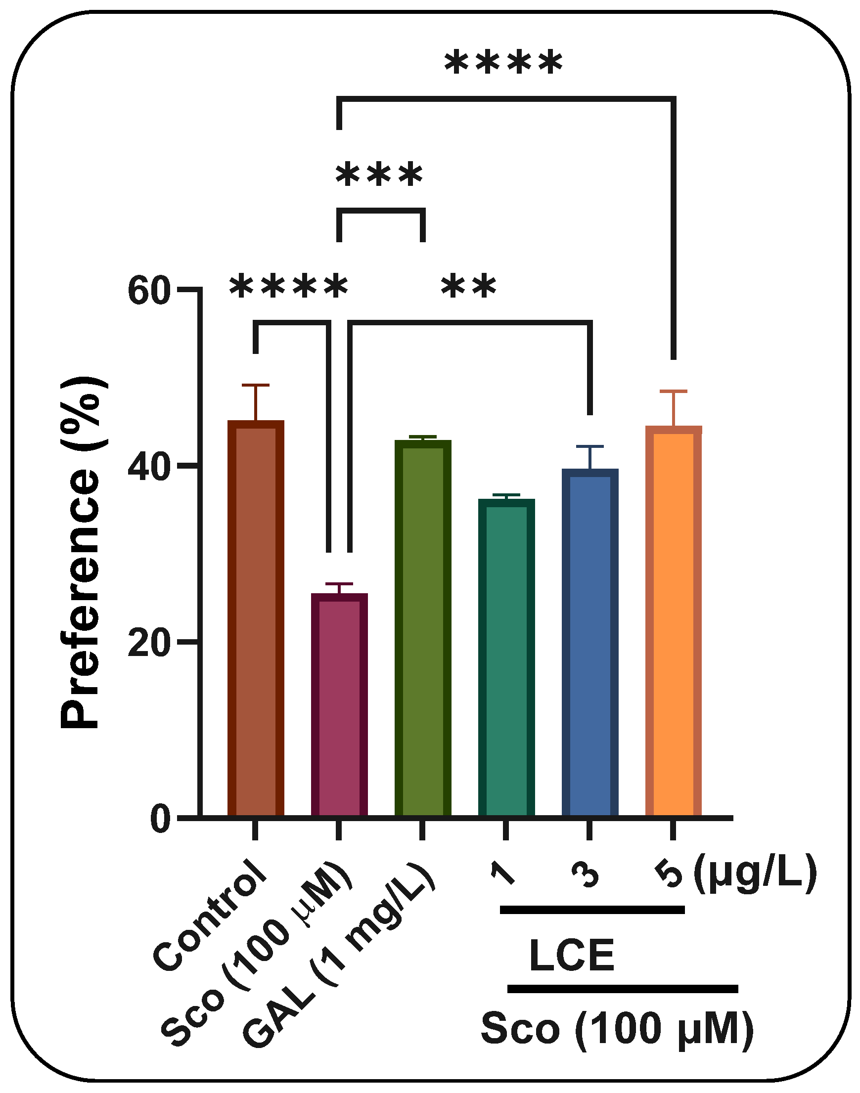 Figure 9. The effects of LCE (1, 3 and 5 μg/L) administration in scopolamine (Sco, 100 µM)-treated zebrafish on the preference percentage evaluated within the novel object recognition test (NOR). Values are means ± S.E.M. (n = 10). For Tukey’s post hoc analyses, **** p < 0.00001, *** p < 0.0001 and ** p < 0.001.