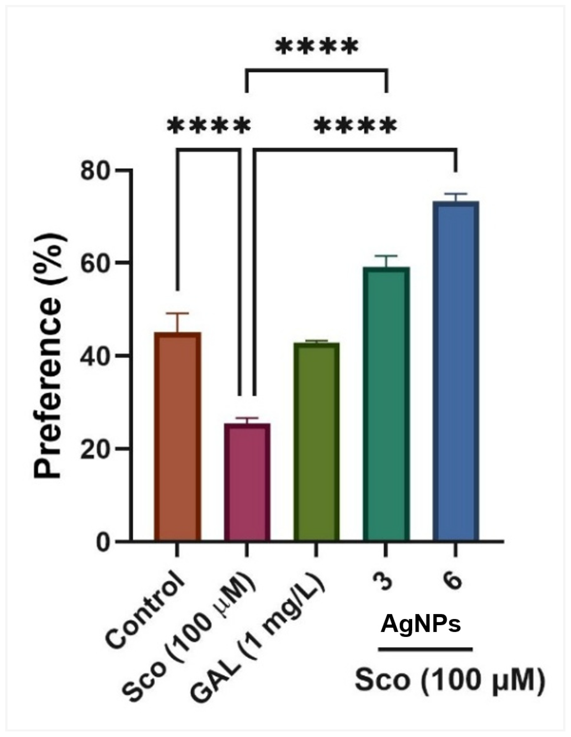 Figure 10. The effects of AgNPs (3 and 6 μg/L) administration in scopolamine (Sco, 100 µg/M)-treated zebrafish on the preference percentage evaluated within the novel object recognition test (NOR). Values are means ± S.E.M. (n = 10). For Tukey’s post hoc analyses, **** p < 0.00001.