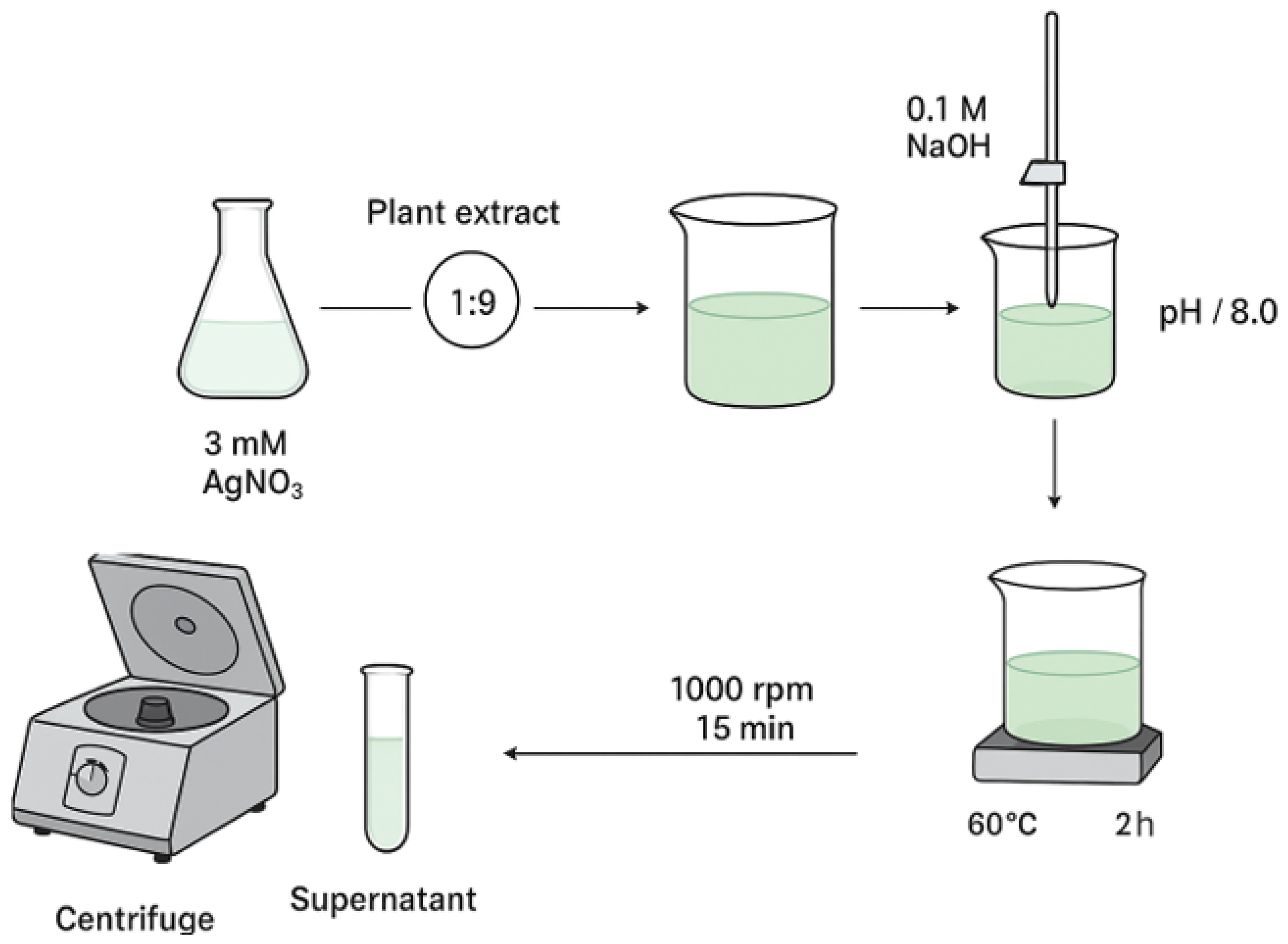 Synthesis was performed following a modified literature method [34], using aqueous AgNO3 at one concentration (3 mM) to ascertain the proper conditions optimal for AgNPs formation (Figure 11). Plant extract and AgNO3 solution were combined at a constant extract-to-salt volume ratio (1:9), maintained throughout all tests. The pH of the reaction was brought up to 8.0 with the gradual addition of 0.1 M NaOH while maintaining continuous stirring. The mixture was kept at 60 °C for 2 h with continuous mixing. After completion, the dispersion was left to cool to ambient temperature and subsequently centrifuged at 1000 rpm for 15 min. The resulting supernatant was collected for future tests confirming the formation of AgNPs.