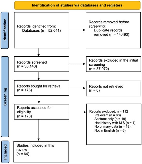 Figure 1 shows the flow diagram of the study protocol. After removing the duplicates, the titles and abstracts of 38,148 studies were screened, of which 176 were selected for full text screening. Only 64 studies met our inclusion criteria. Of the 112 excluded studies, 68 were irrelevant, 18 had no primary data, 19 were not peer reviewed or were abstracts only, 6 were not in English, and 1 had history with MIS. Supplementary Table S1 summarizes the demographic and clinical data of the included subjects as well as the quality assessment score for each study [15,16,17,18,19,20,21,22,23,24,25,26,27,28,29,30,31,32,33,34,35,36,37,38,39,40,41,42,43,44,45,46,47,48,49,50,51,52,53,54,55,56,57,58,59,60,61,62,63,64,65,66,67,68,69,70,71,72,73,74,75,76,77,78].