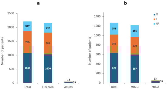 Number of patients and their gender in (a) COVID-19 patients and (b) MIS patients.