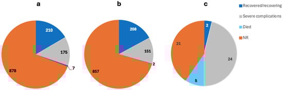 The 64 included studies reported a total of 3024 cases of MIS post-COVID-19. Excluding Mejais et al., Davies et al., and Maddux et al., who did not report the gender, 50.08% of the patients were M, 30.16% were F, and 19.76 were NR and all aged between 2 months and 80 years (Figure 2b) [56,64,65]. The outcome was NR for 69.13% of the patients, while 16.54% were reported as recovered/recovering, 13.78% had severe complications, and 0.55% died (Figure 3a).