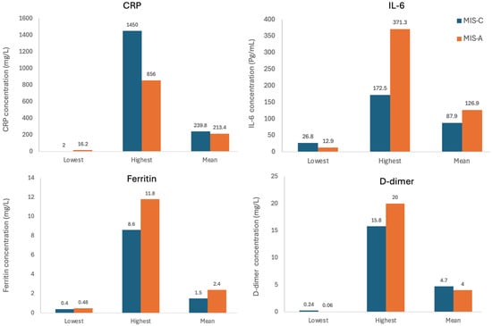Lowest, highest, and mean levels of CRP, IL-6, ferritin, and D-dimer in the MIS-C and MIS-A groups as reported by the included studies.