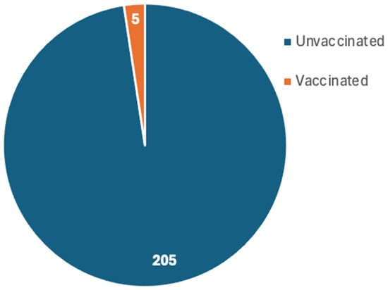 Only 18 studies reported the vaccination status [19,20,21,24,26,27,30,34,35,37,38,40,42,43,45,49,60,64], which reported a total of 210 patients who developed MIS post-COVID-19 infection. The compiled results revealed that 205 patients were unvaccinated while only 5 patients were vaccinated (Figure 5).
