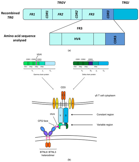 The germline-encoded HV4 loop of the T cell receptor (TCR) of Vγ4+ γδ IELs directly binds to BTNL3. (a) HV4 is located at amino acid positions 10–25 in the FR3 of the TRGV4 segment [31]. (b) The HV4 of Vγ4+ γδ T cells binds to the C, C”, F, and G canonical immunoglobulin-fold β-strands (CFG face) of the BTNL3 protein [29]. Abbreviations: CDR: complementarity-determining region; FR: framework region; HV4: hypervariable region 4; TRGJ: T cell receptor γ joining region; TRGV: T cell receptor γ variable region.