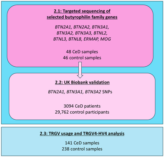 The impact of genetic variation in the butyrophilin family of genes and the HV4 sequence of duodenal γδ T cells on CeD predisposition was examined in three studies (Figure 2). First, 48 CeD and 46 control samples were subjected to targeted sequencing to capture SNPs in 10 butyrophilin family genes known to be expressed in small intestinal tissues and immune cells. The sequenced butyrophilin variance in CeD samples was burden tested via the control samples. Next, these results were validated, subjecting all available BTN2A1, BTN3A1, and BTN3A2 SNPs to single-variant testing, in a cohort of 3094 CeD and 29,762 control participants from the UK Biobank genome-wide genotyping database. Finally, targeted sequencing of the TRGV4-HV4 sequence was undertaken in 141 CeD and 238 control samples, to investigate the association between TRGV4-HV4 variation and CeD risk.