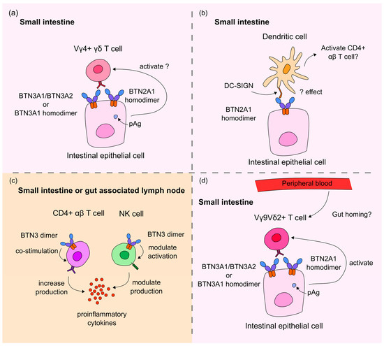 Secondly, BTN2A1 variants may predispose patients to CeD, via BTN2A1’s role as a ligand for DC-SIGN on DCs, which are important in CD pathogenesis in presenting gluten antigens to CD4+ αβ T cells [24,25]. Thus, BTN2A1 might regulate the autoimmune response in CeD indirectly via DC activity (Figure 4b). Additionally, previous evidence has shown that BTN3 proteins can provide co-stimulatory signals to αβ T cells, increasing their production of interferon-γ (IFN-γ), a proinflammatory cytokine [26]. This same study showed the dual effect of butyrophilins on NK cell activity: BTN3A1 upregulated, while BTN3A2 downregulated IFN-γ production and NK cell activation (Figure 4c).