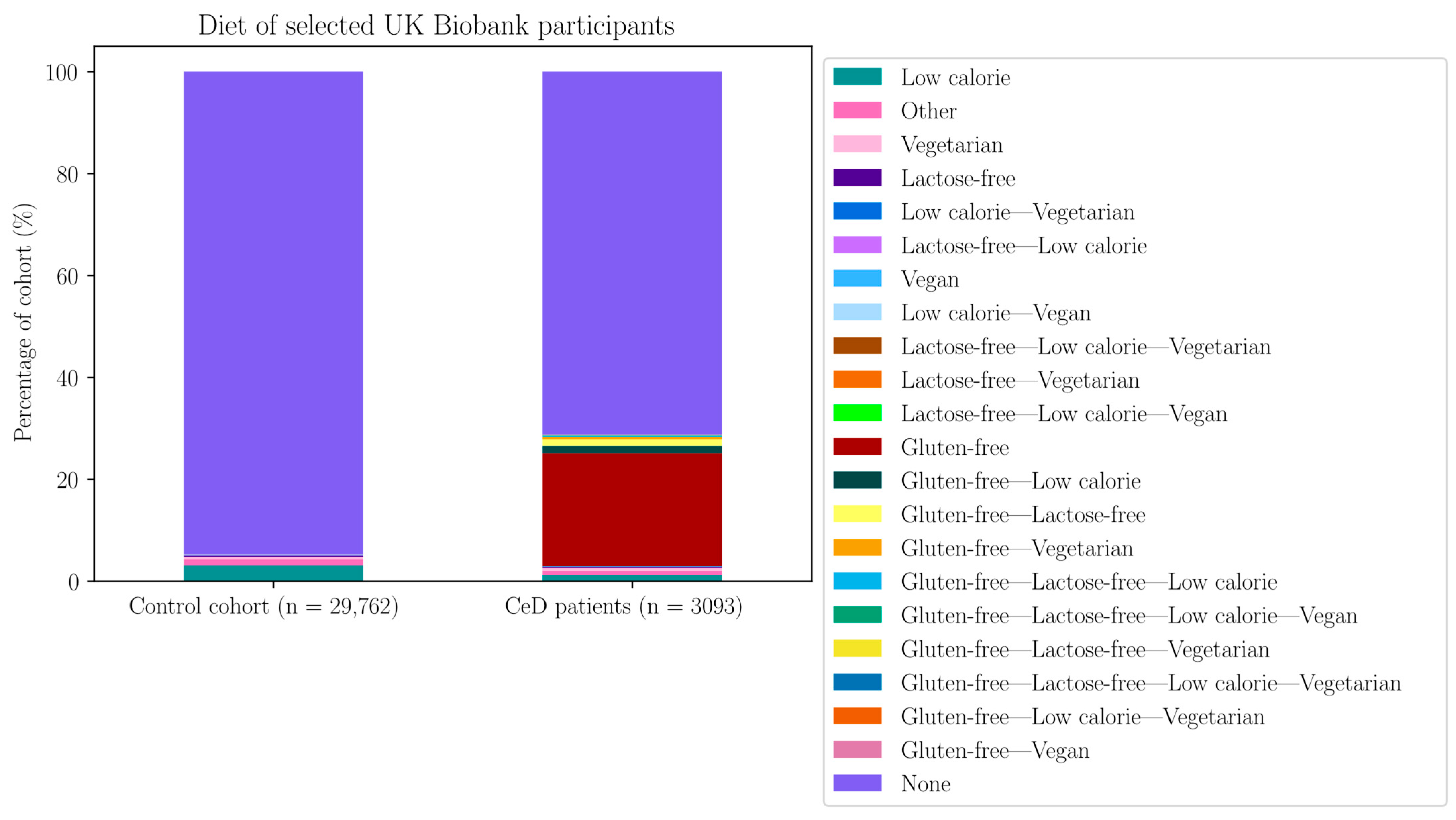 - Hospital diagnosis record includes coeliac disease: ICD9 (5790), ICD10 (K90.0);