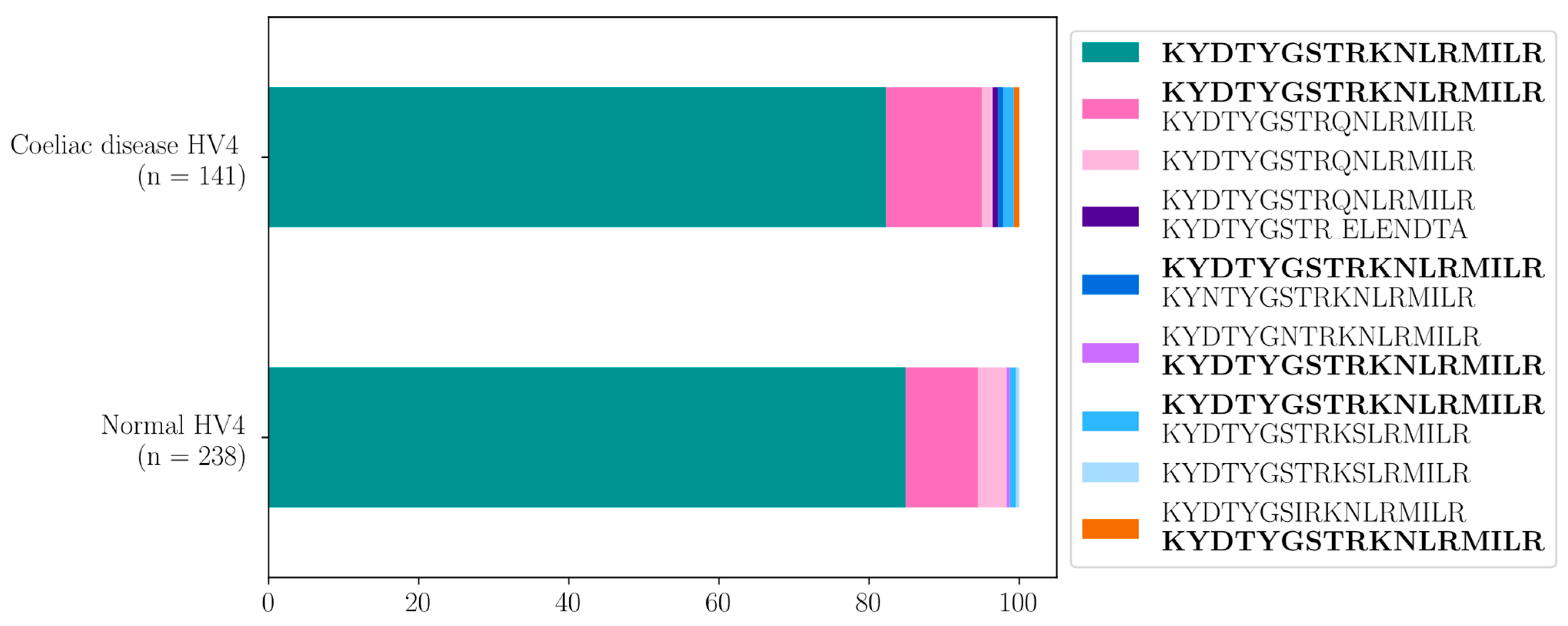 | HV4 Amino Acid Sequence | Amino Acid Change | Effect | Freq. in Healthy Control Samples (n = 238) | Freq. in CeD Samples (n = 141) | Predicted Change in Binding [31] |