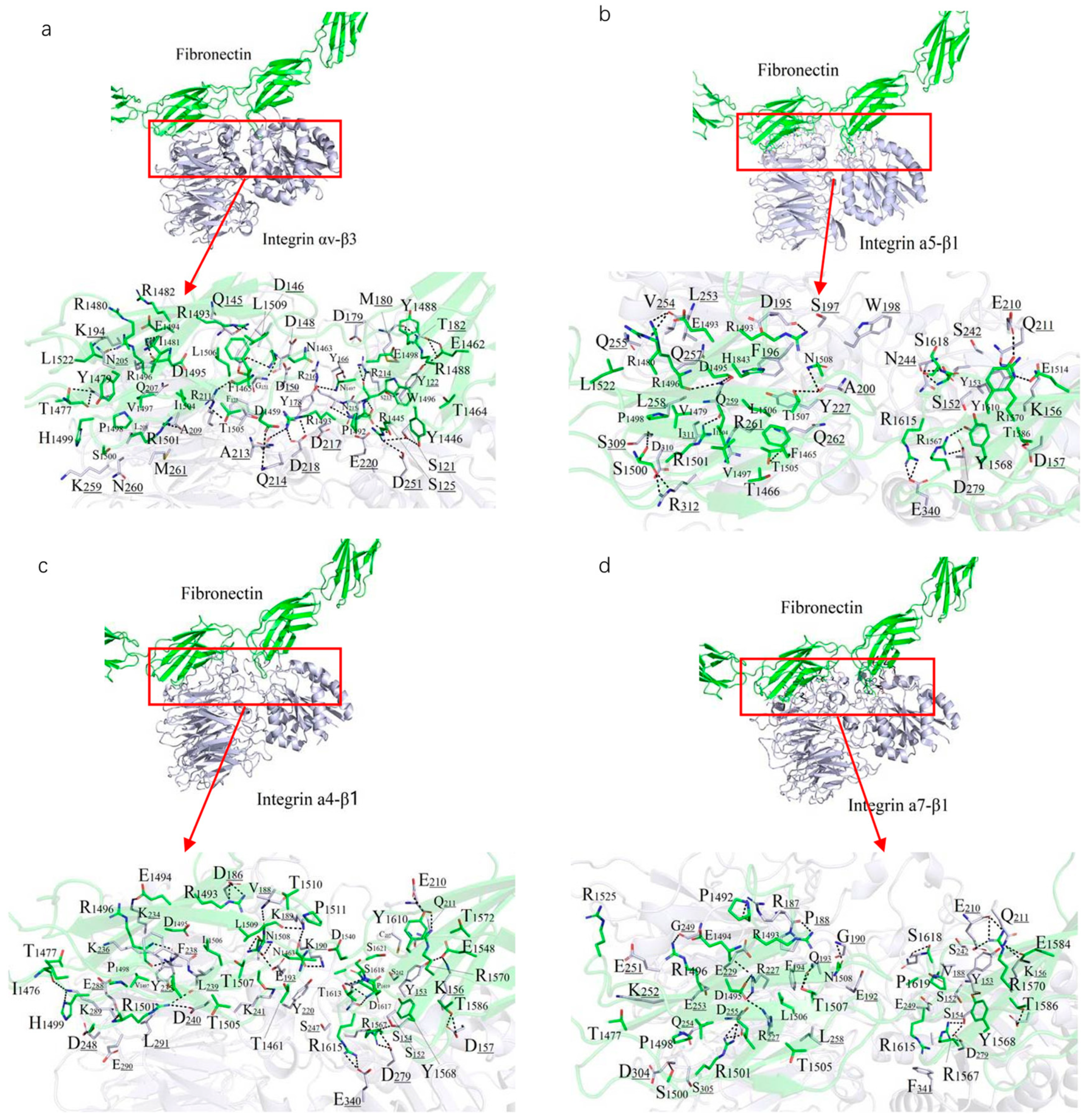 A 10 ns MDs was performed to refine the binding models of FN with four integrin subtypes (α4-β1, α5-β1, αv-β3, and α7-β1). The binding interfaces primarily involve the FN10 region, with specific interaction regions spanning residues 1459–1624 across the four complexes (