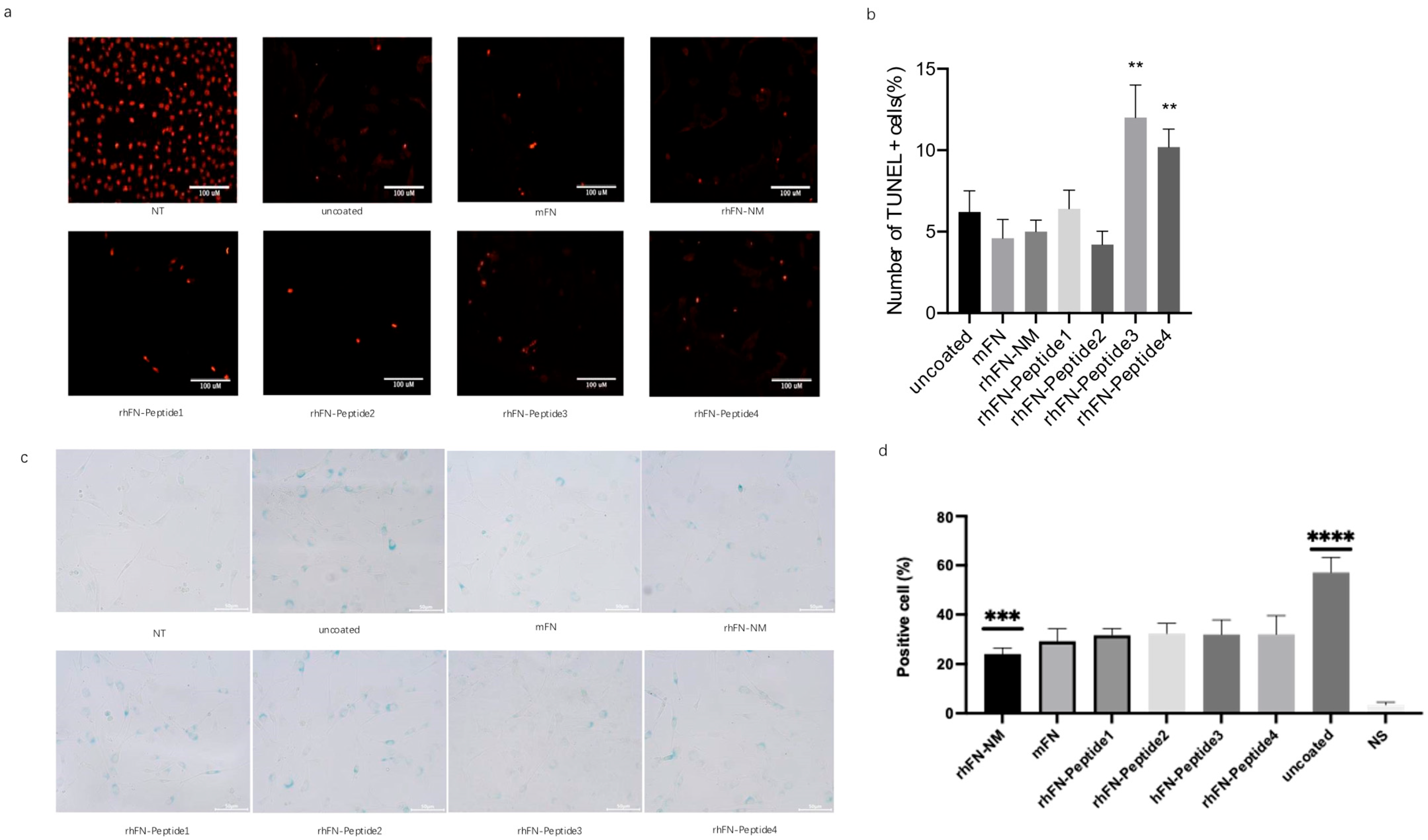 To confirm the inhibitory effect of the constructs on apoptosis, apoptosis rates were measured using the TUNEL assay. Positive rates of apoptotic cells were lower in the rhFN-NM, mFN, rhFN-Peptide1 and rhFN-Peptide2 groups than in the uncoated control group (