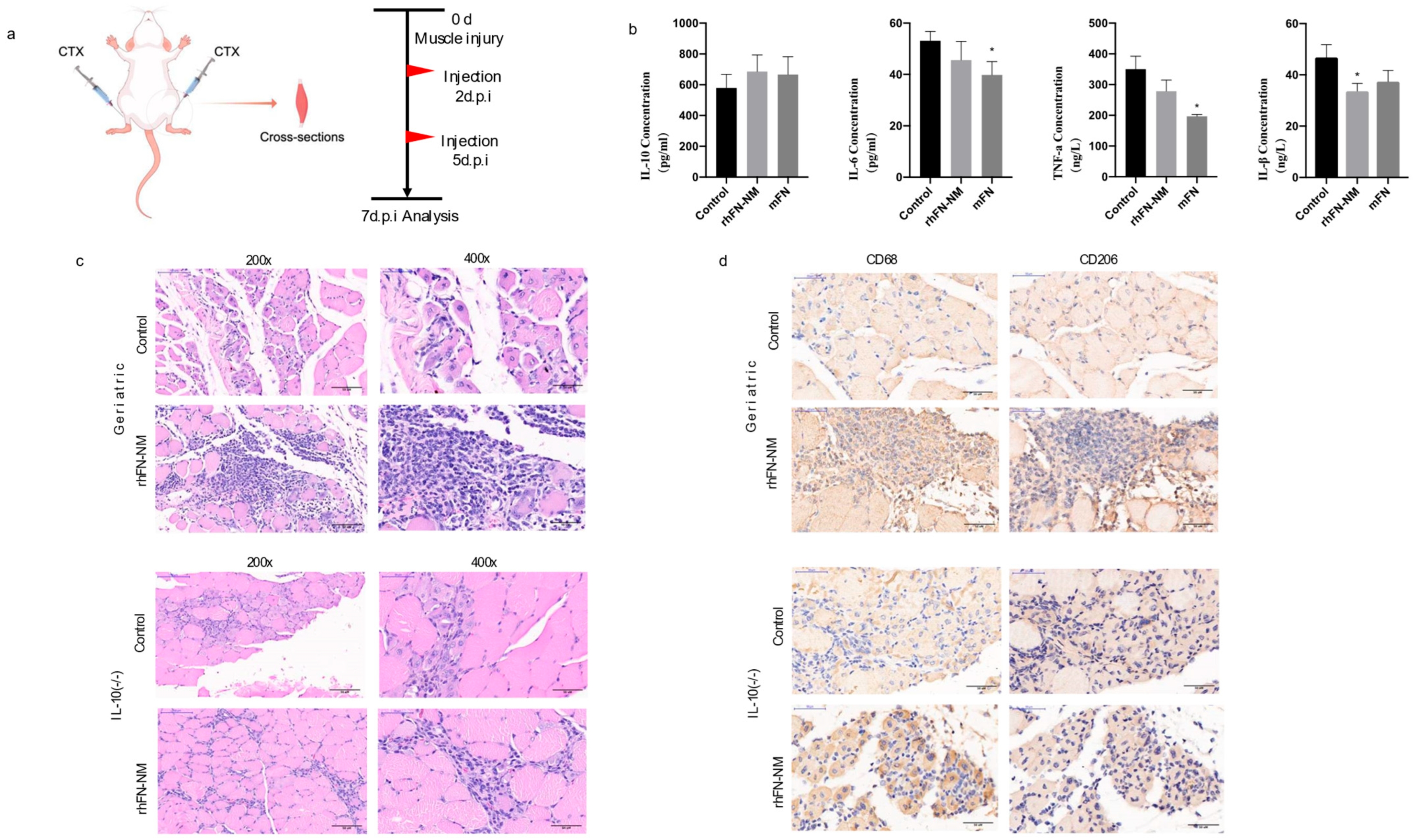 We measured the levels of inflammatory cytokines (IL-1β, IL-6, TNF-α and IL-10) in the serum samples from Geriatric mice following CTX muscle injury using ELISA(Mouse IL-6 (H007), Mouse IL-10 (H009-1), Mouse IL-18 (H002), and Mouse TNF-α (H052-1);Nanjing Jiancheng Bioengineering Institute; Nanjing, China). In the rhFN-NM group, reduction was observed for pro-inflammatory IL-6 and TNF-α, but anti-inflammatory IL-10 increased. In the mFN group, the levels of pro-inflammatory cytokines, such as IL-6, TNF-α and IL-1β were reduced, while the concentration of the anti-inflammatory cytokine IL-10 increased (