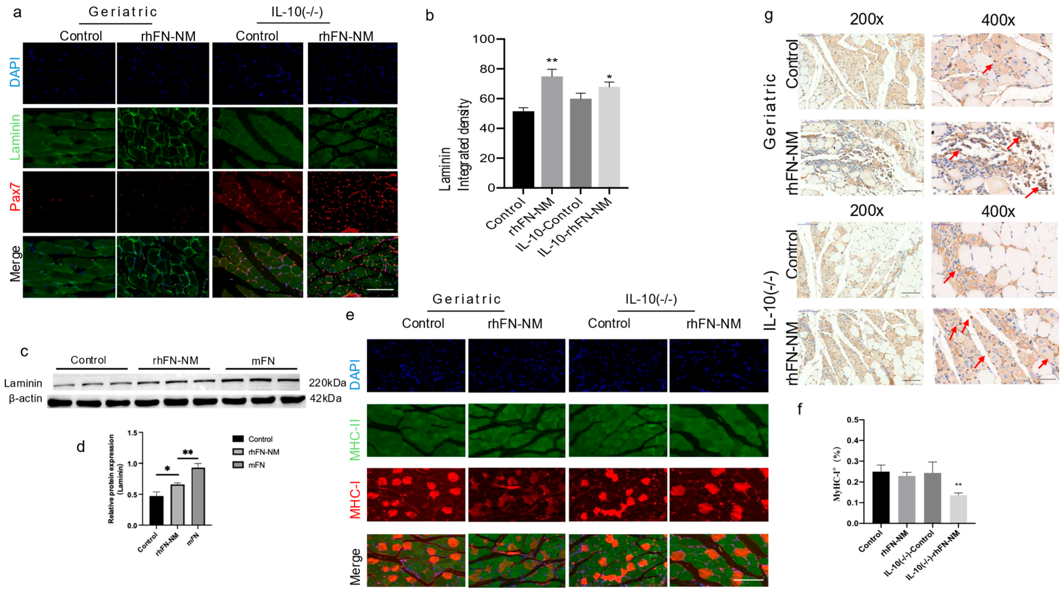 Figure 9a), the Pax7 positivity rate in the rhFN-NM group was higher than in the Control group, whereas in the IL-10-rhFN-NM group it was higher than in the IL-10-Control group. Similarly, in the rhFN-NM group, the average fluorescence intensity of laminin was higher than in the Control group, whereas, in the IL-10-rhFN-NM group, it was higher than in the IL-10-Control group (