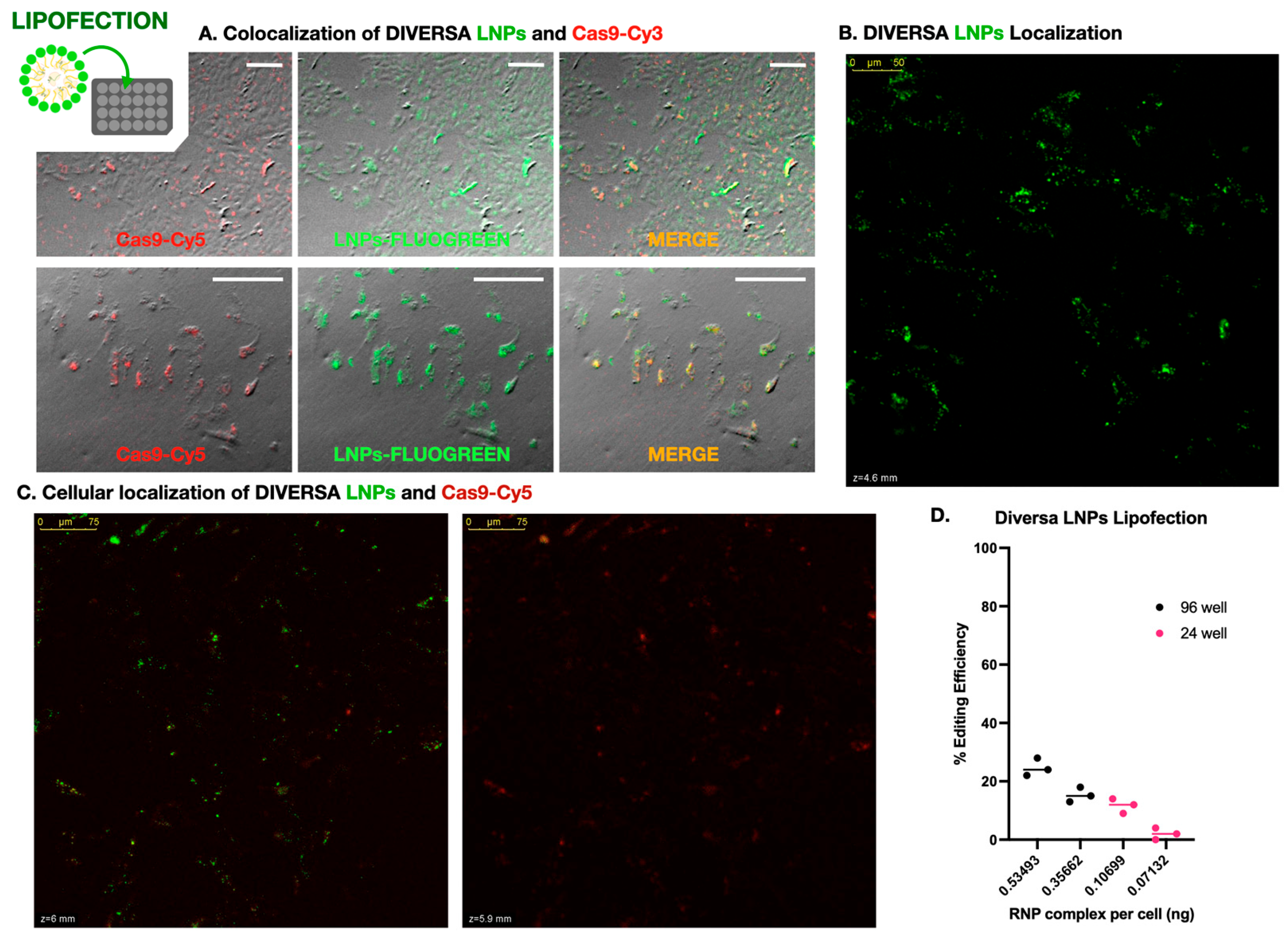 Figure 2). As a first step, we evaluated whether DIVERSA lipid nanoparticles (LNPs) could successfully deliver Cas9–sgRNA complexes into cells. Using FLUOGREEN-labeled LNPs and Cy3-labeled Cas9, we performed widefield fluorescence microscopy and observed widespread green signals in nearly all cells, indicating robust association with the nanoparticles (
