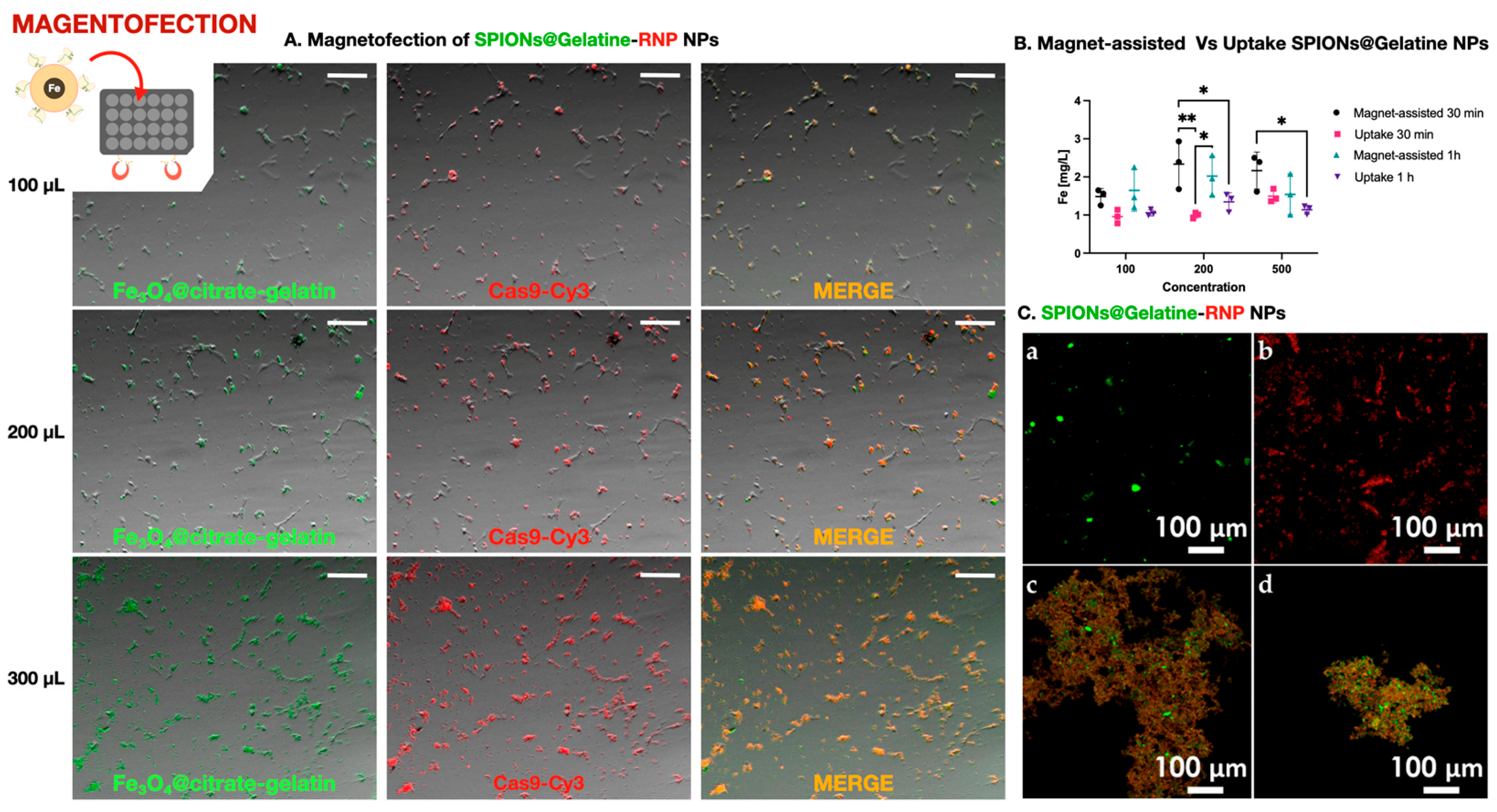 Figure 3C) provide fluorescence-based visualization of SPIONs@Gelatin and their bioconjugation with fluorescent Cas9–sgRNA complexes.