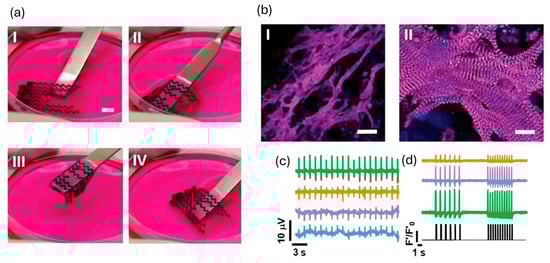 MXenes are two-dimensional (2D) transition-metal carbides, nitrides, and carbonitrides with large surface areas and hydrophilic functional groups; their surfaces present many active sites that enhance adsorption of key ions []. In Basara et al. [], soft poly(ethylene glycol) (PEG) hydrogels were first fabricated as supportive scaffolds, and Ti3C2Tx MXene patterns were then deposited directly onto the PEG surface via aerosol-jet printing. Because aerosol-jet printing achieves cell-scale resolution, it effectively guides single-cell alignment. Given PEG′s inherent resistance to non-specific cell adhesion, cardiomyocytes selectively attached and aligned along the MXene tracks. The study reported enhanced synchronous beating, expanded beating areas, and conduction velocities up to ~6.5 cm/s upon MXene integration.