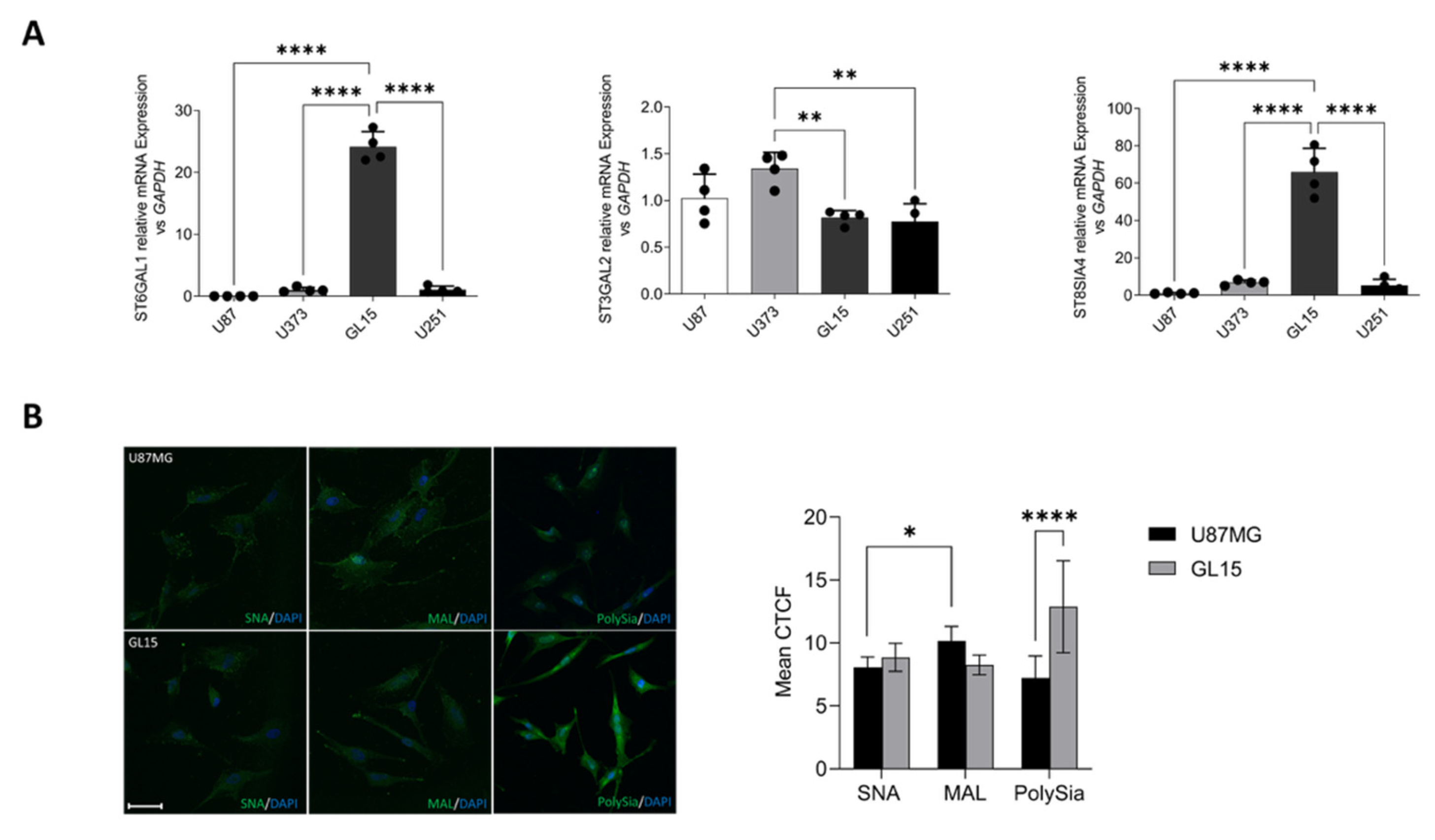 2.2. GBM Cell Lines Express Differential Levels of Sialyltransferases and Sias