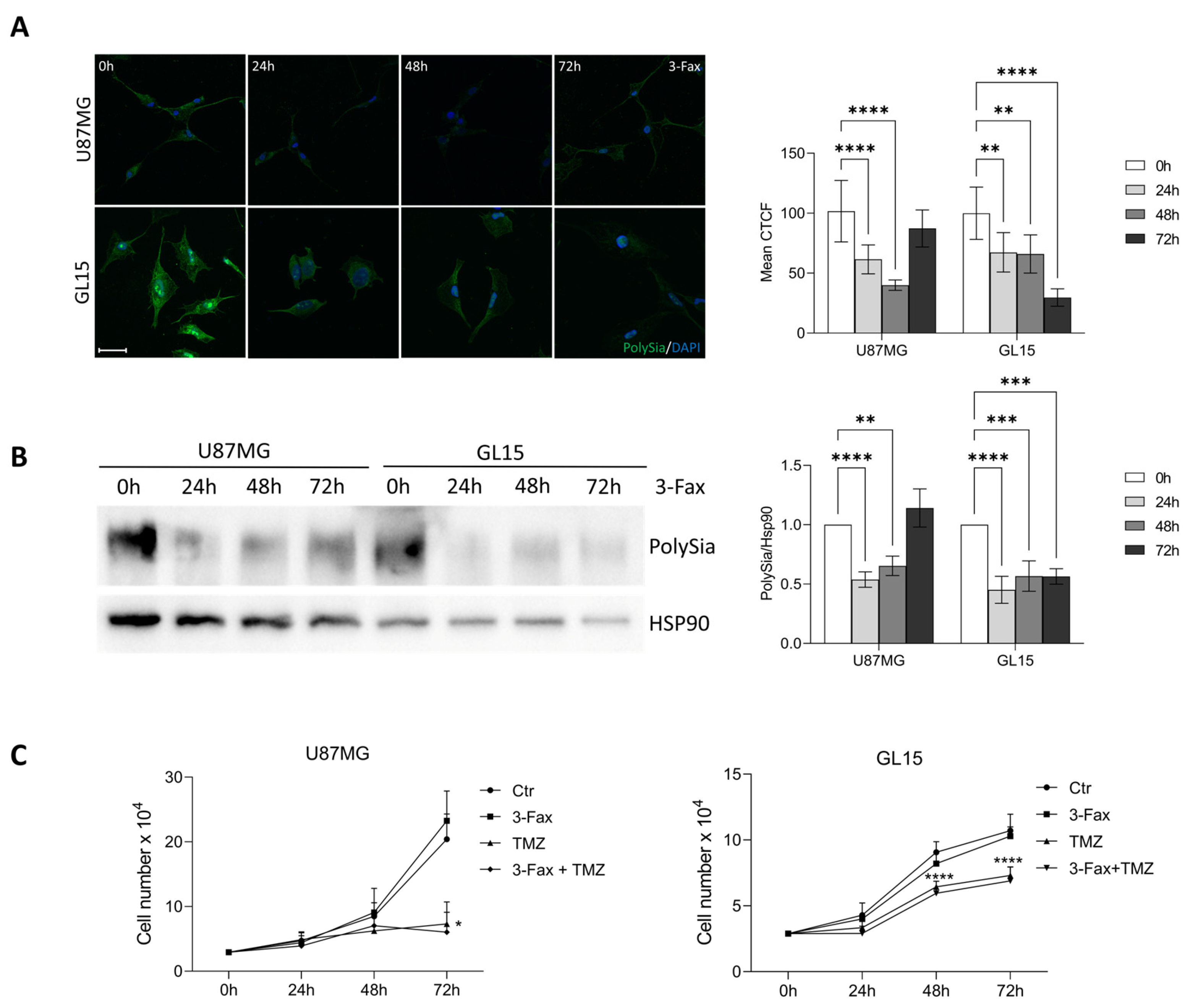 - Rosa, P.; Scibetta, S.; Pepe, G.; Mangino, G.; Capocci, L.; Moons, S.J.; Boltje, T.J.; Fazi, F.; Petrozza, V.; Di Pardo, A.; et al. Polysialic Acid Sustains the Hypoxia-Induced Migration and Undifferentiated State of Human Glioblastoma Cells. Int. J. Mol. Sci. 2022, 23, 9563. [Google Scholar] [CrossRef] [PubMed]